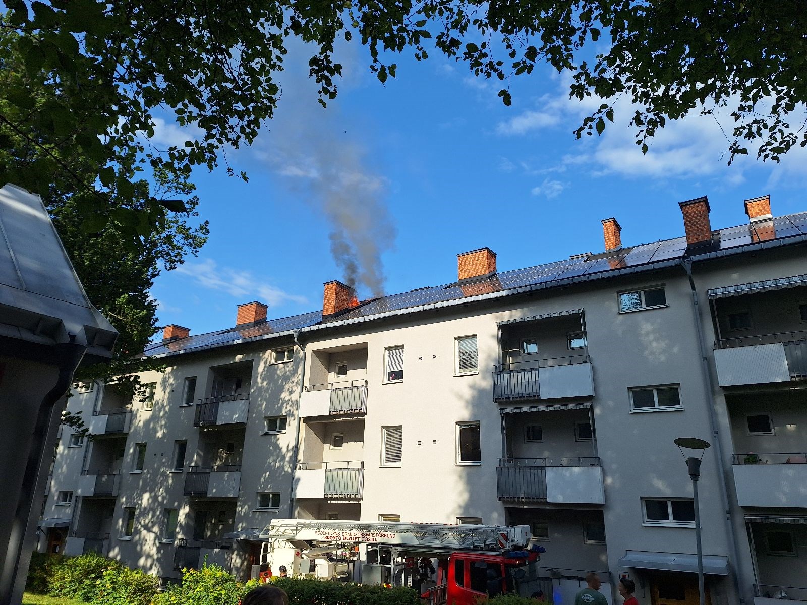 Natten den 4 juli började det brinna på taket till ett flerfamiljshus i Emmaboda. Flera familjer evakuerades och släckningsarbetet pågick under många timmar. För SVTs lokalnyheter beskrev räddningstjänsten att insatsen var komplicerad eftersom taket var täckt med solcellspaneler.
